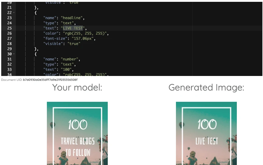As you understood reading the "Getting Started - commons" section of the documentation, every text, image, colors within a document created with our editor can be updated in real time via the API.