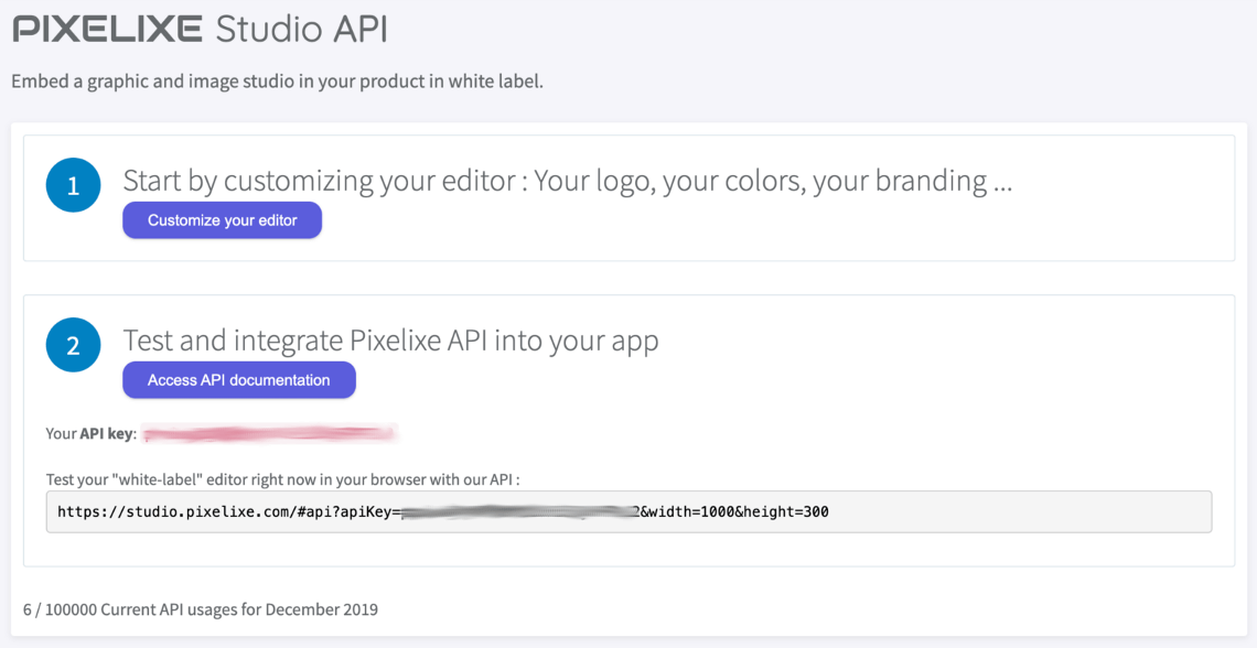 Once logged-in, from the Dashboard, select the "White label Editor API" section from the left or central panel. Then, you will be asked to first "Customize your editor", and then to test your API :