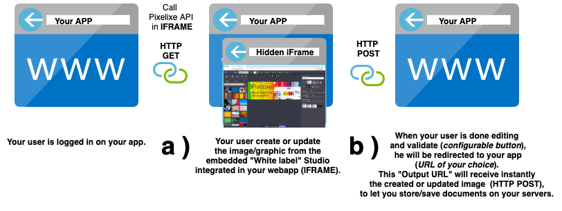 Pixelixe APIs enables you to embed a top of the art "White label" graphic design studio into your own website. With this embedded Design Studio, let your visitors and users create their own graphics easily directly from your website or webapp. Then, every created document can be pushed in real time on your servers (PNG, JPEG, HTML or PDF format).